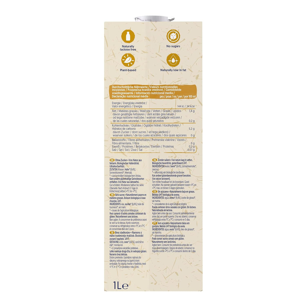 Alpro Bio Sugar Free Haferdrink est une boisson à l'avoine biologique sans sucre ajouté, idéale pour ceux qui souhaitent une option naturelle avec un profil gustatif équilibré, parfaite pour le café, les céréales ou dégustée nature.