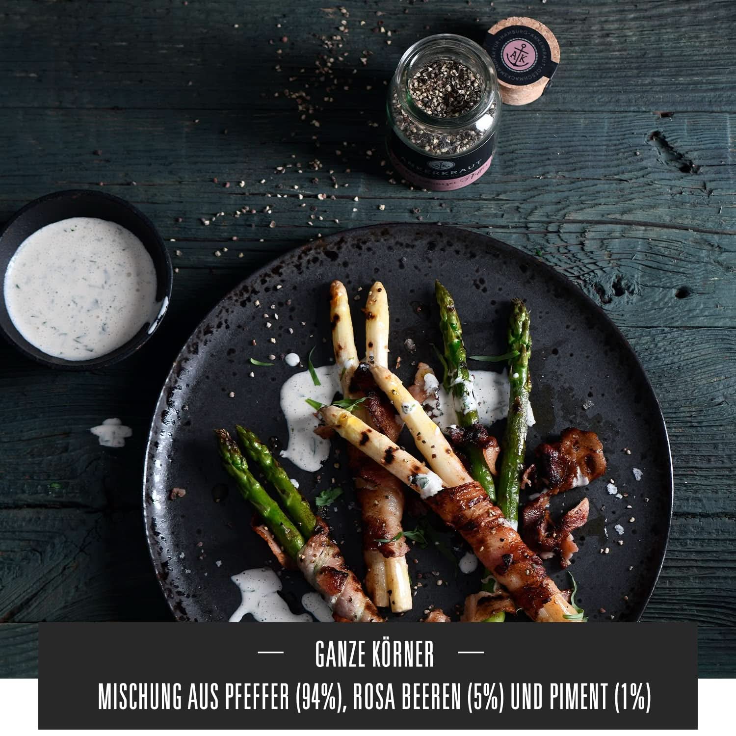 Dans Pepper Symphony, différentes variétés de poivre s’harmonisent pour former un ensemble unique et riche. Le poivre blanc (poivre sans peau, mûr), le poivre vert (fruit non mûr, récolte précoce), le poivre noir (fruit pas mûr à presque mûr), le poivre rose (fruit schinus : fruit séché du poivrier péruvien) et le piment (piment girofle : fruit non mûr, récolte précoce) sont les protagonistes de cette symphonie. Bien que tous les ingrédients ne soient pas du « vrai poivre », ils complètent le mélange pour créer une saveur agréable et épicée. Aussi bien adapté comme poivron grillé que pour les sauces et les soupes !