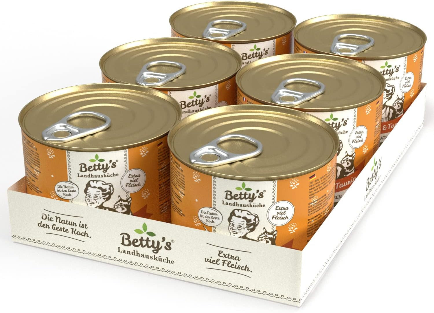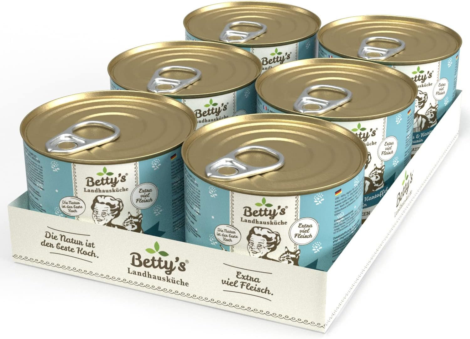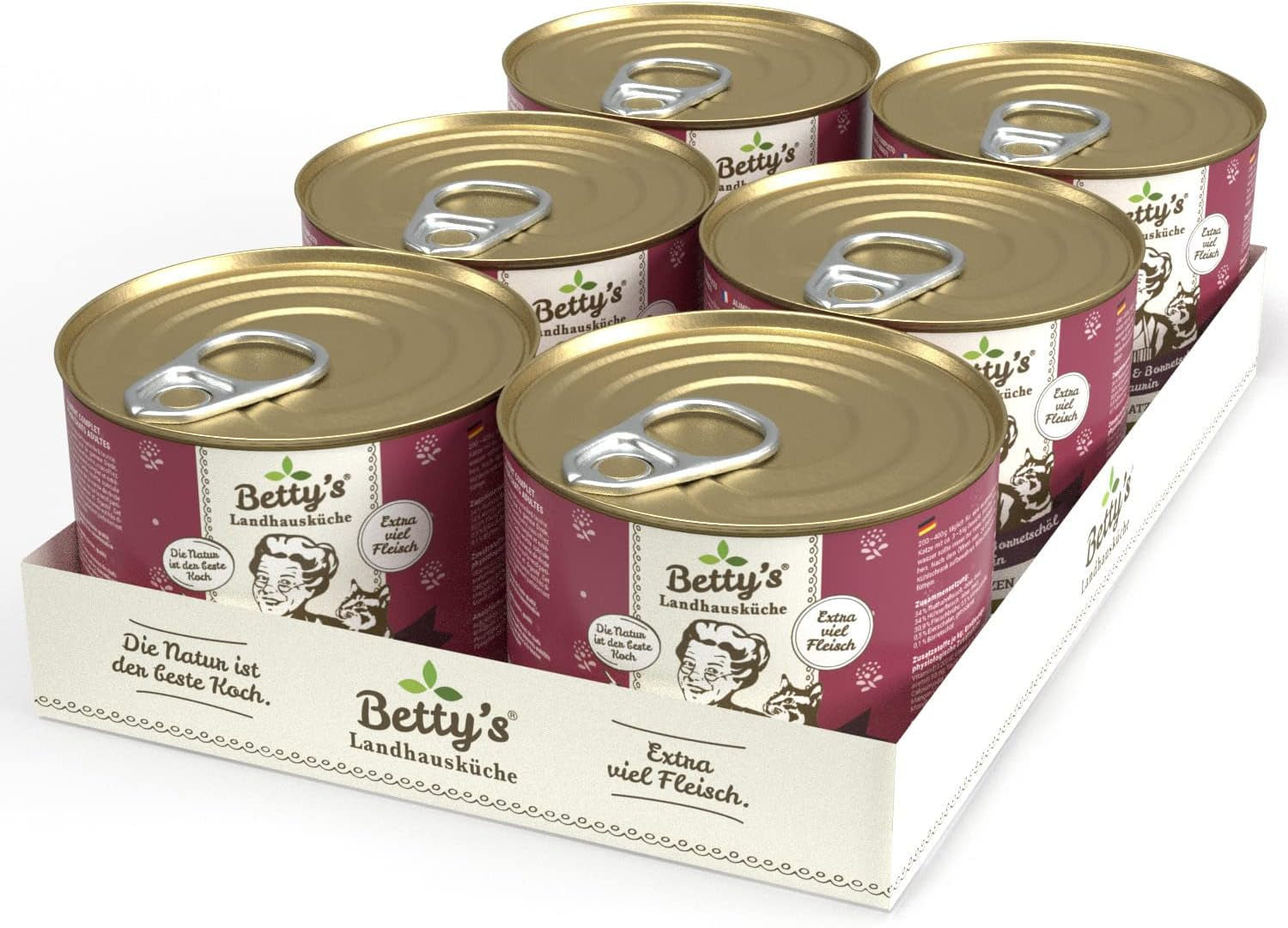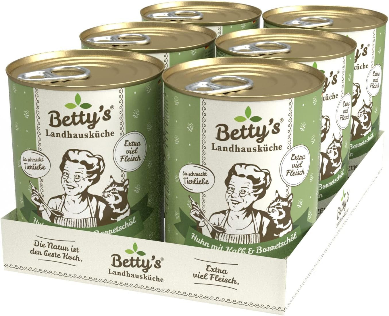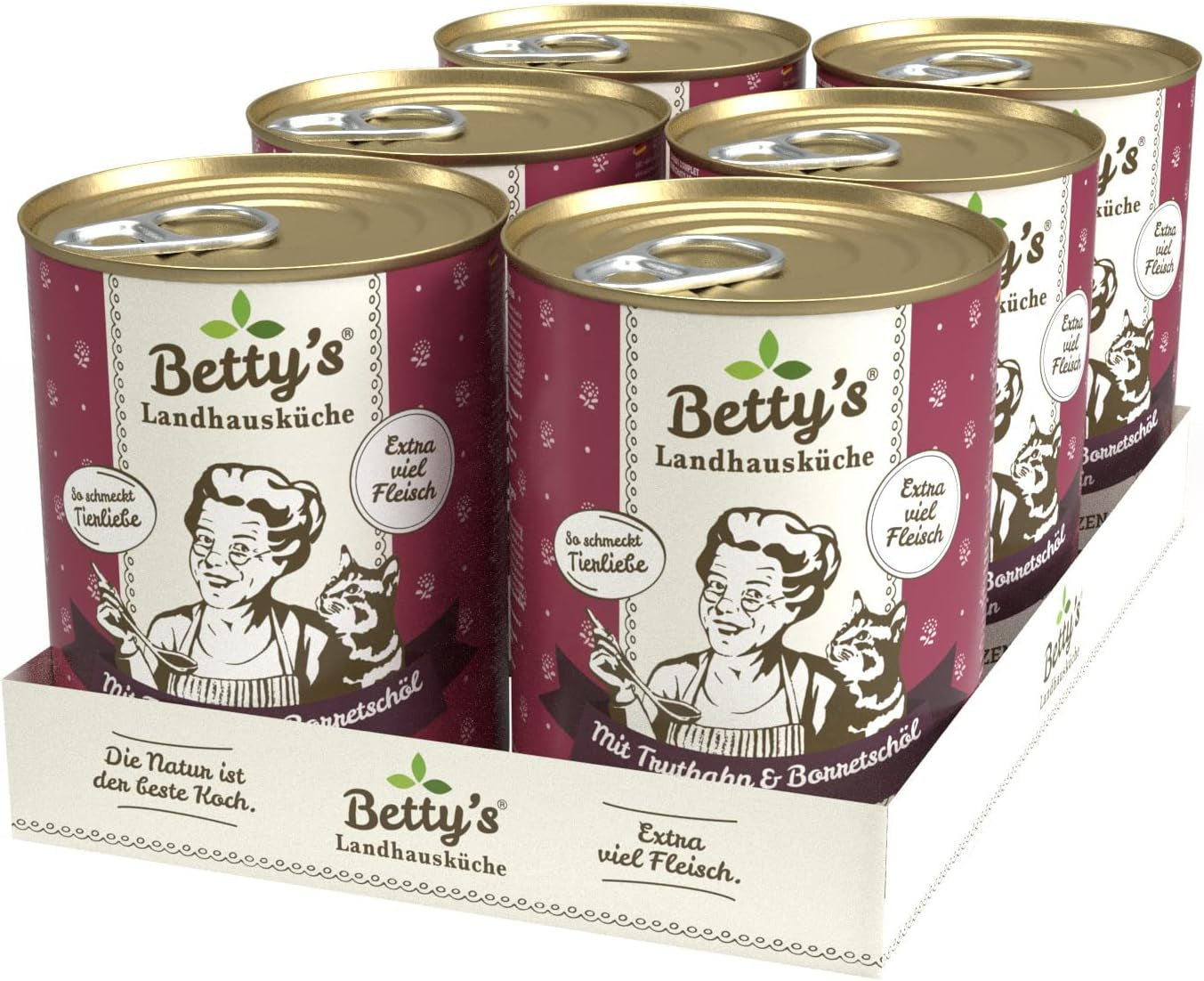 Boîte de nourriture humide pour chat Betty'S Landhausküche, Sans céréales, Meilleure qualité, Viande de haute qualité, Cuisson douce, Convient à toutes les races de chats, Poulet et faisan à l'huile de bourrache 6 X 200 G