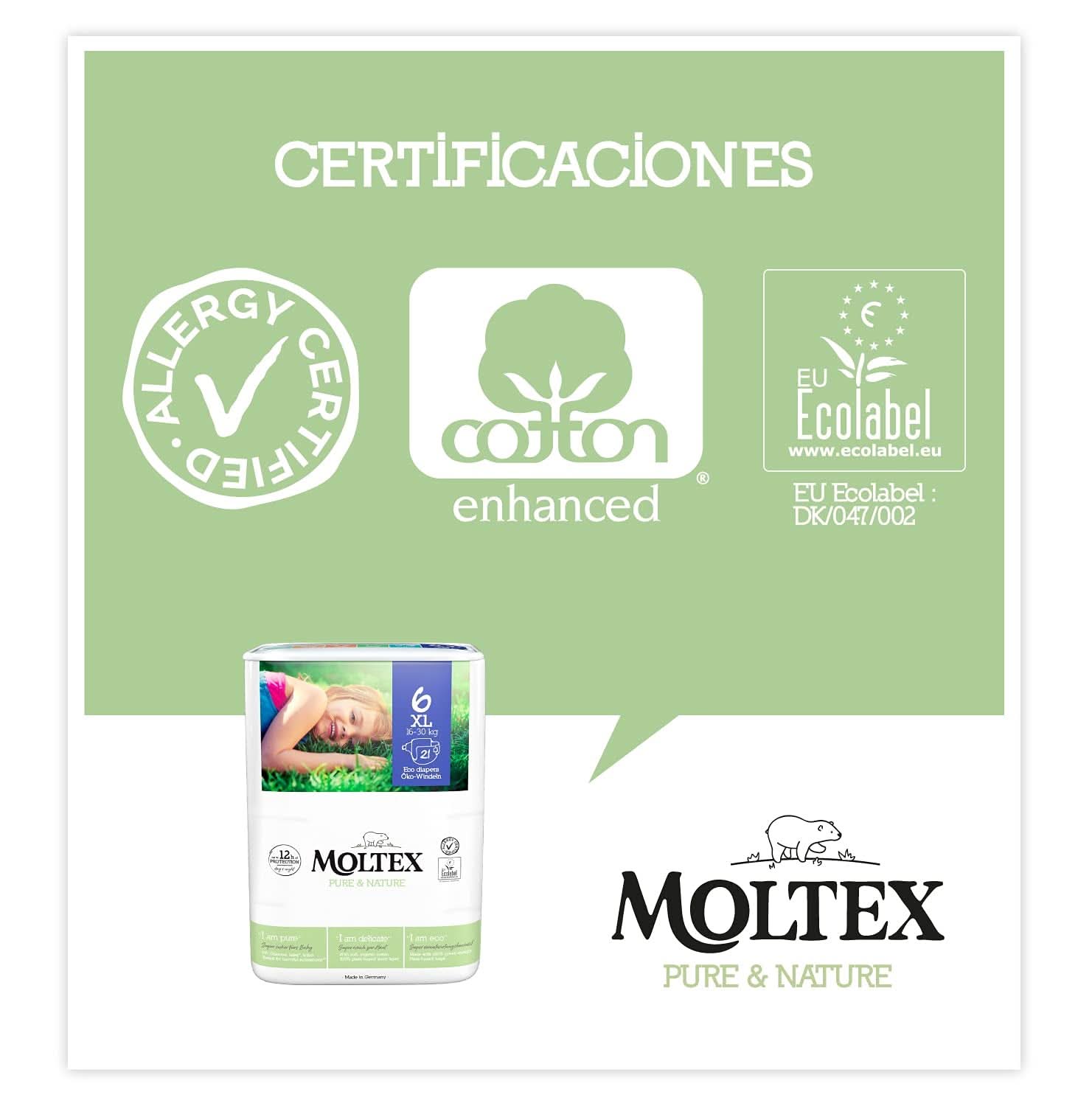 Les nouvelles couches Moltex Pure & Nature sont sans danger pour votre bébé et pour la planète, sans compromettre leur efficacité. Les couches Moltex Pure & Nature combinent notre technologie de canal brevetée avec un système de séchage instantané unique qui offre à votre bébé jusqu'à 12 heures de protection. Fabriqué à partir de matériaux plus naturels, sans danger pour la peau de bébé et respectueux de l'environnement. Le voile intérieur est 100% végétal, testé dermatologiquement, et le voile extérieur est en coton biologique doux. 0% de chlore, latex naturel et lotions. Testés pour les substances nocives. De plus, nos couches sont fabriquées avec une énergie 100 % propre, respectueuse de l'environnement. Tous ces avantages sont testés et certifiés par des organismes indépendants possédant des labels de qualité internationaux.