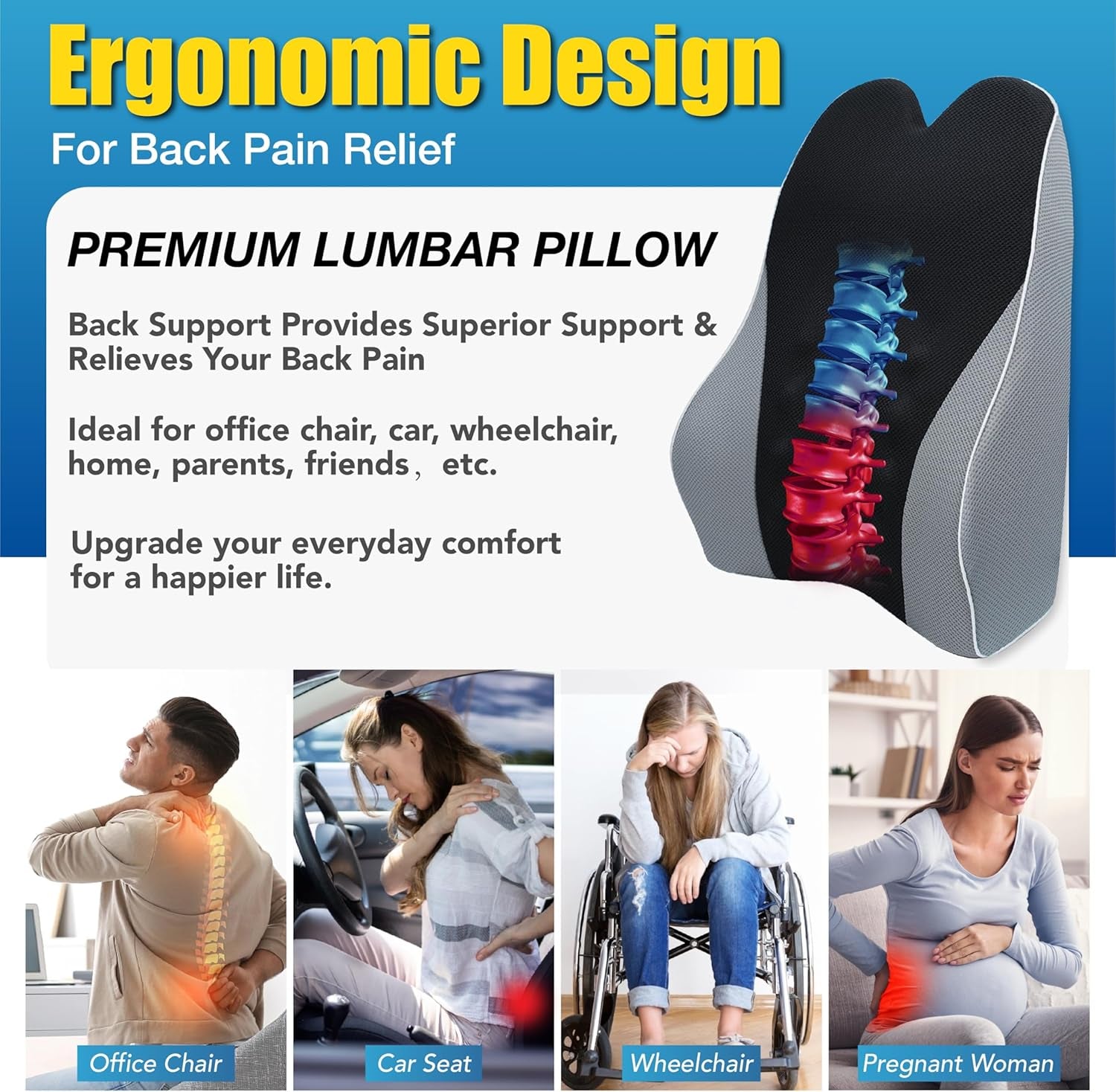 - « Oreiller lombaire ergonomique pour soulager les maux de dos » Cet oreiller dorsal de conception professionnelle offre confort et soulagement de la douleur grâce à son contour 4D innovant. Les trois lignes lombaires surélevées s'adaptent avec précision à la courbure naturelle du dos, favorisant une posture correcte, soulageant les maux de dos et la sciatique causée par une position assise prolongée.