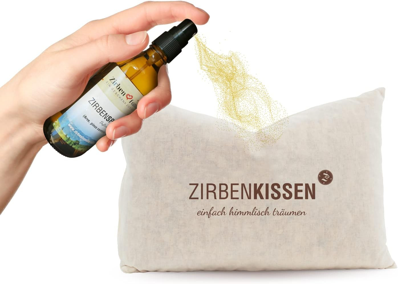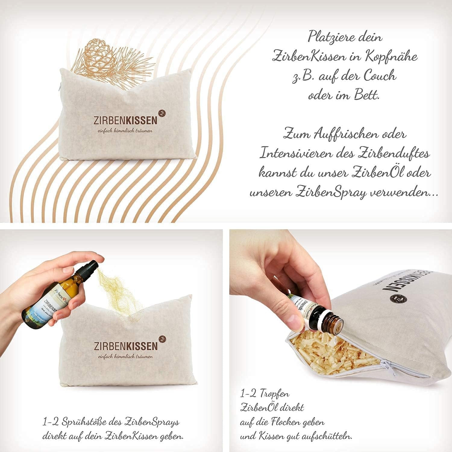 - â¤ï¸ SIMPLEMENT APAISANT : Cet oreiller en pin suisse diffuse un arôme parfumé - parfait pour une atmosphère agréable la nuit ! Si vous ajoutez 1 à 2 gouttes de notre spray de pin cembro de haute qualité à votre oreiller en pin cembro, le parfum du pin cembro s'intensifie. â¤ï¸ VOICI COMMENT L'odeur DU PIN : les flocons de pin 100 % naturels dégagent un parfum boisé léger et agréable. Une combinaison avec ZirbenFamilie ZirbenÖl ou ZirbenSpray intensifie encore plus le parfum.