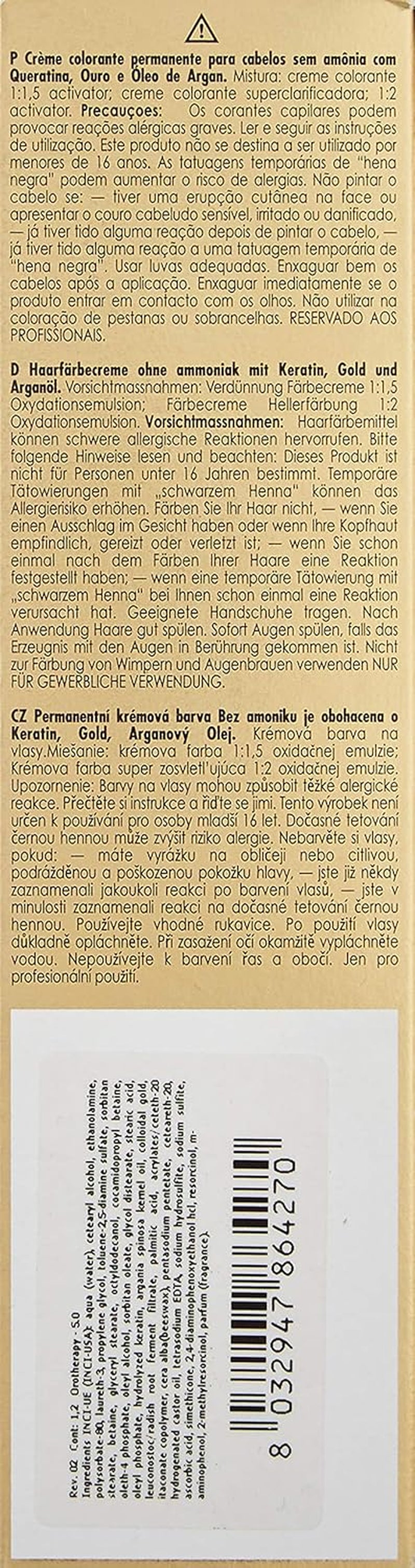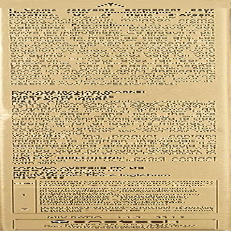 Oro Therapy Color Keratin Teinture capillaire permanente sans ammoniaque Oro Puro avec kératine, huile d'argan et or 24 carats couverture maximale des gris couleurs vives teneur en pigments accrue pour des couleurs plus durables rend les cheveux doux et soyeux et hydrate un effet protecteur élevé et une restructuration des cheveux peut également être utilisée sur les cuirs chevelus sensibles éclaircissant avec 4-5 niveaux de tons texture douce et crémeuse pour un résultat de mélange parfait et une application facile application facile inodore disponible en 40 nuances + 3 nuances plus claires. Le nouveau système de coloration de Fanola a été développé pour combiner et perfectionner les 3 résultats de coloration capillaire les plus importants : une couverture maximale des cheveux gris, une brillance et une douceur incomparables et une protection parfaite des cheveux. Ingrédients : Or 24 carats : donne brillance et brillance aux cheveux avec luminosité et effet anti-âge simultanés. Tous les produits Oro Puro contiennent des microparticules d'or pur 24 carats dans une solution en suspension. Cela signifie que ces particules sont si petites qu’elles ne peuvent pas être déposées ou filtrées. Cette propriété permet aux microparticules d’or de pénétrer immédiatement dans la structure du cheveu lors de l’application du produit. De cette façon, tous les avantages du métal peuvent être utilisés sans l’effet secondaire d’alourdir les cheveux. Huile d'argan : Protège, éclaircit, nourrit et renforce les cheveux. Riche en vitamine E, elle aide à prévenir le vieillissement capillaire et protège les cheveux des radicaux libres. Kératine : Restaure la vitalité des cheveux et renforce la structure capillaire. Favorise une coloration intense et longue durée des cheveux.