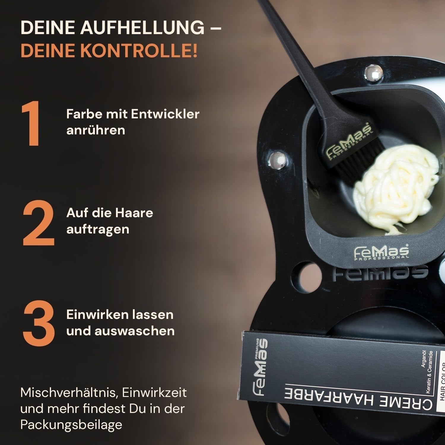 - OXYCREAM DE PRO : Notre agent oxydant impressionne par sa consistance crémeuse, qui facilite l'application de la pâte colorante sur les cheveux. Le résultat : une couleur longue tenue et un développement ultra précis des couleurs. AUSSI INDIVIDUEL QUE VOUS : Avec notre FemMas Oxycreme, en option avec 3%, 6%, 9% et 12%, vous pouvez mélanger votre propre nuance de couleur et éclaircir vos cheveux de 1 à 5 nuances. Plus le pourcentage est élevé, plus le résultat de la couleur est clair. COMME C'EST FACILE : Mélangez la couleur avec Oxycreme jusqu'à l'épaisseur souhaitée selon les instructions. N'oubliez pas une cape et des gants de protection ! Appliquez une quantité généreuse de couleur sur cheveux non lavés et laissez durcir. Laver avec un peu d'eau et bien rincer. Lavez ensuite vos cheveux avec un shampoing et revitalisez-les avec un après-shampooing.