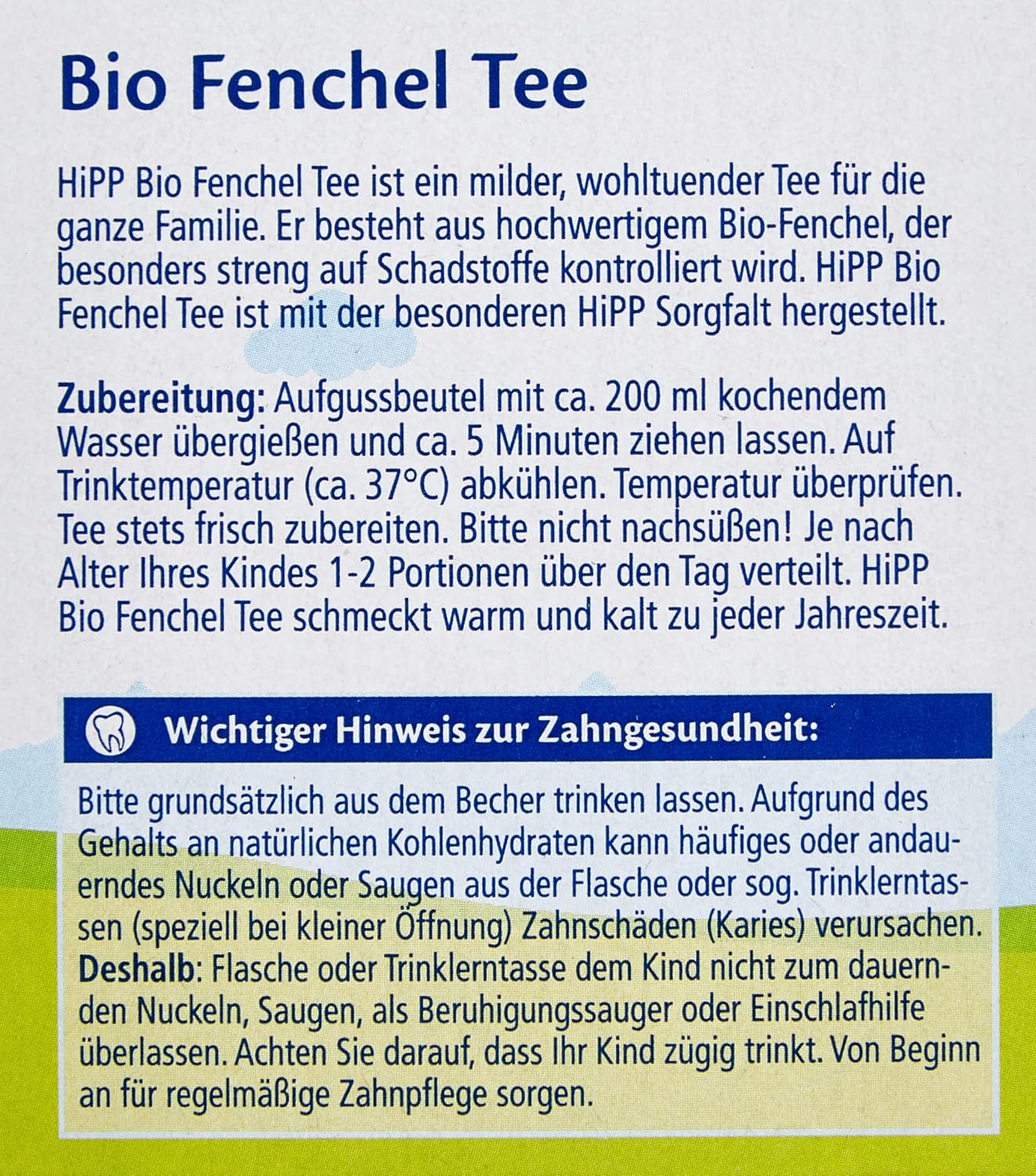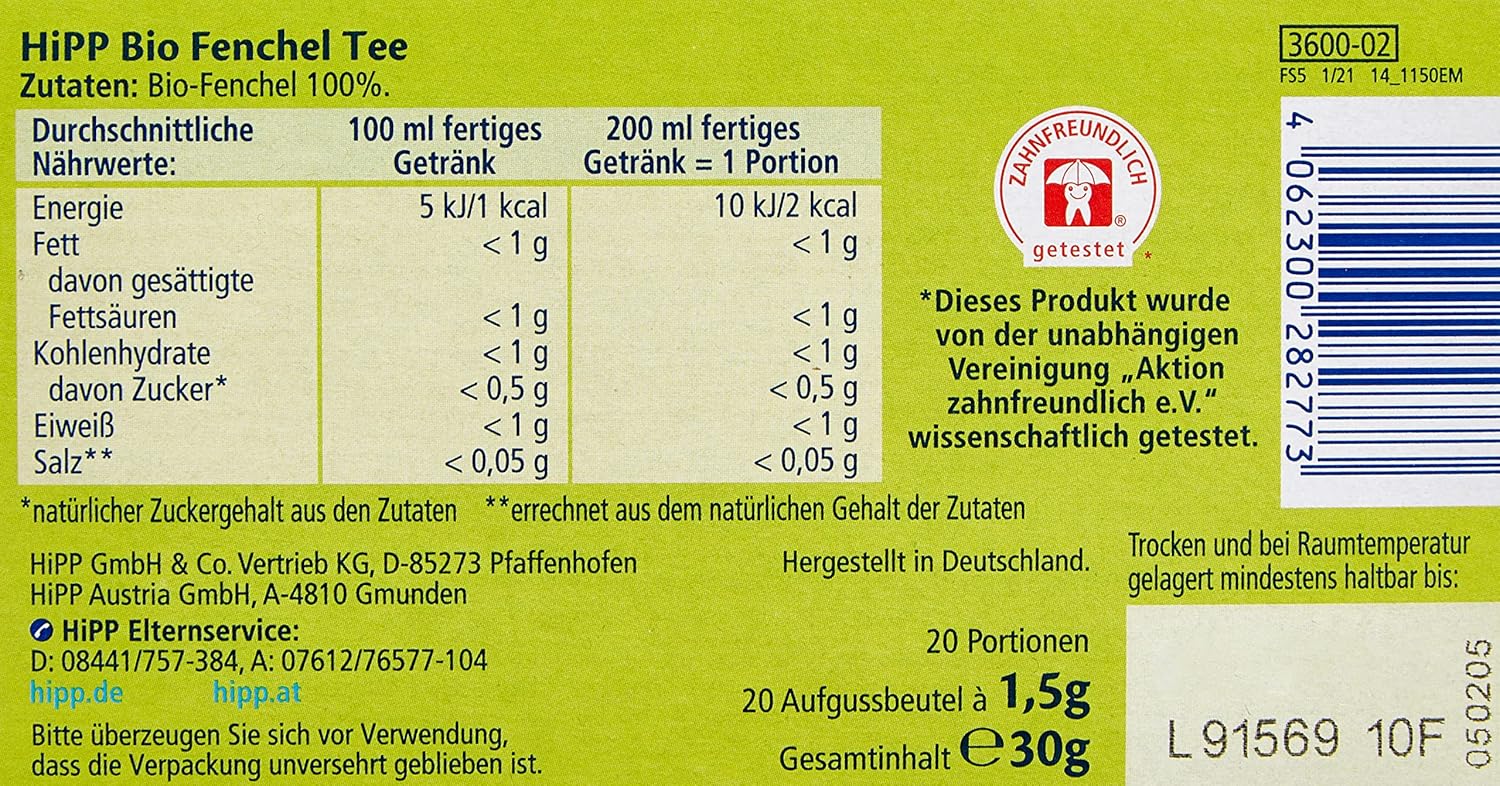 Le thé à la camomille biologique HiPP est un thé doux et apaisant. Il est fabriqué à partir de camomille biologique de haute qualité, strictement contrôlée pour les substances nocives. Le thé à la camomille biologique HiPP est fabriqué avec des soins spéciaux HiPP et il a été prouvé qu'il respecte les dents. Sans sucre et sans ajout d'arômes ni de conservateurs, il est idéal en premier thé.