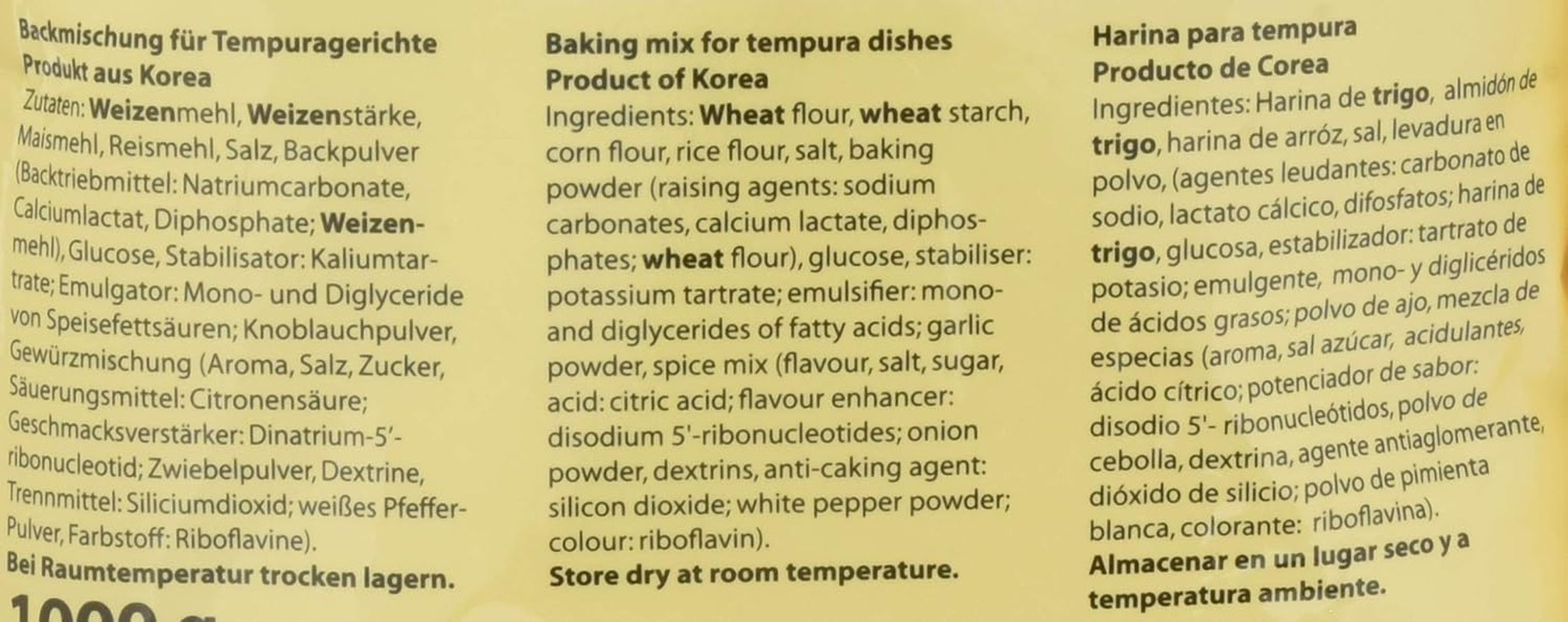 Weizenmehl, Weizenstärke, Maismehl, Reismehl, Salz, Backpulver (Backtriebmittel : Natriumcarbonate E500, Calciumlactat E327, Diphosphate E450 ; Weizenmehl), Glucose, Stabilisant : Kaliumtartrate E336 ; émulsifiant : Mono- et Diglycéride de Speisefettsäuren E471 ; Knoblauchpulver, Gewürzmischung (Aroma, Salz, Zucker, Säuerungsmittel: Citronensäure E330; Geschmackverstärker: Dinatrium-5'-ribonucléotide E635; Zwiebelpulver, Dextrine, Trennmittel: Siliciumdioxid E551; weißes Pfeffer Poudre, Farbstoff : Riboflavine E101)