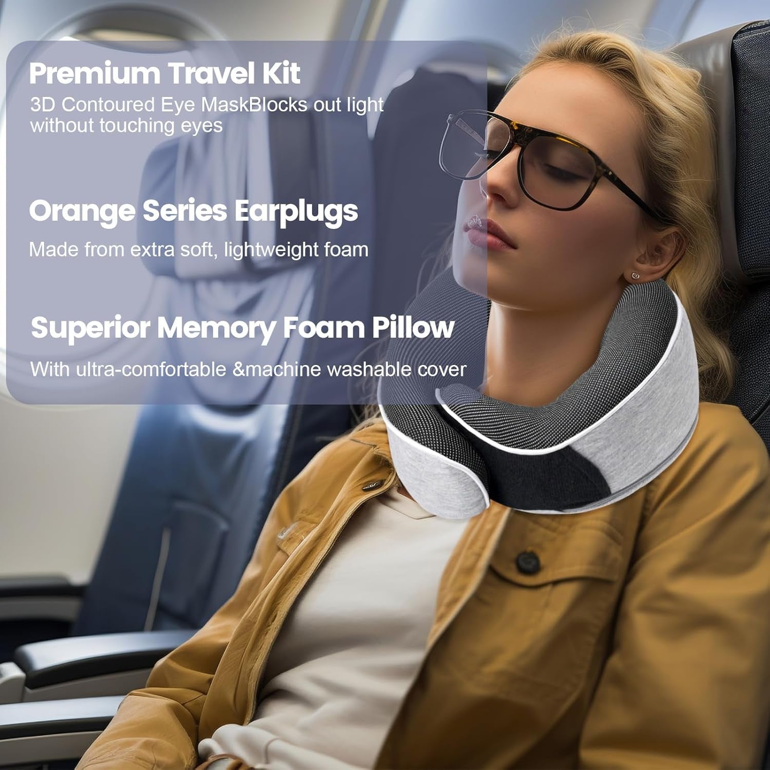 Oreiller cervical, oreiller de voyage en mousse à mémoire de forme, oreiller cervical en mousse à mémoire de forme, design ergonomique, avec masque pour les yeux, 2 bouchons d'oreille et sac de rangement, parfait pour dormir sur la route en voyage