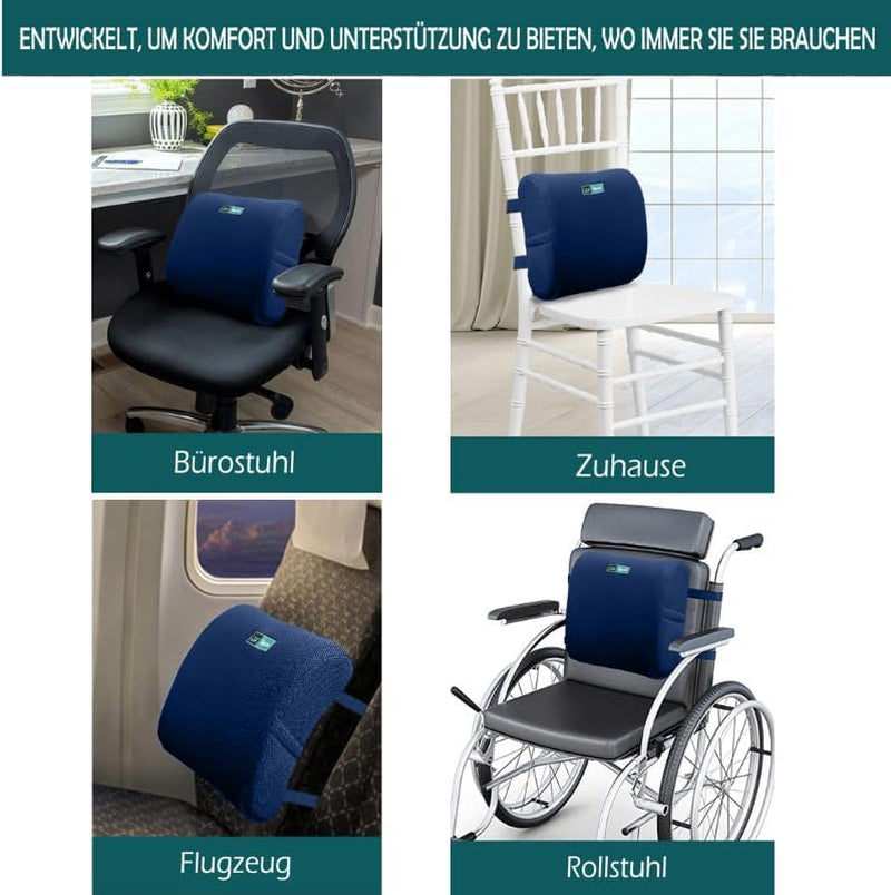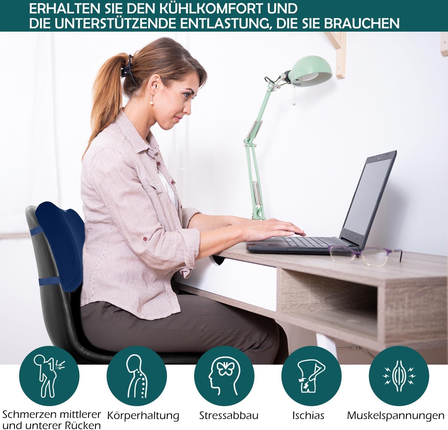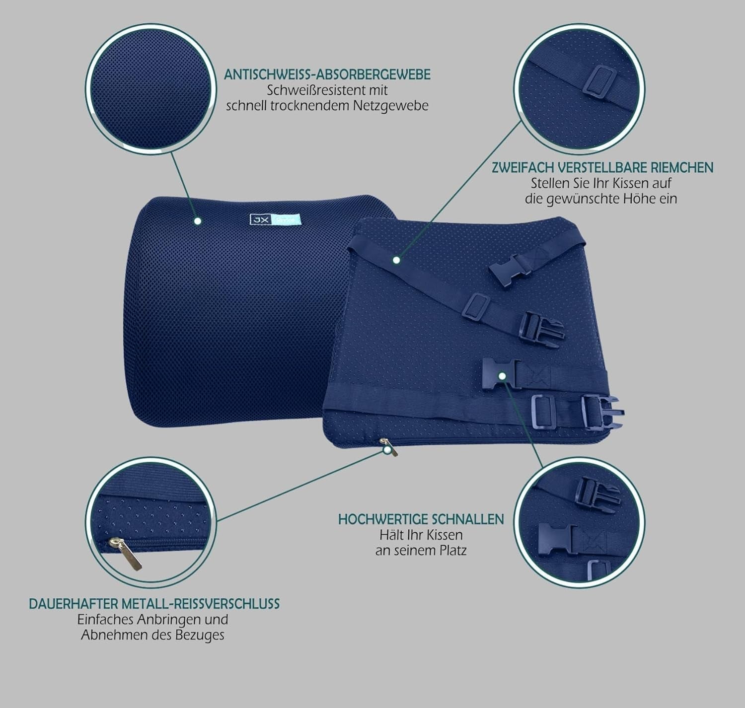 Oreiller ergonomique bleu pour le dos, soulage et prévient les maux de dos – Oreiller lombaire en mousse à mémoire de forme pour le bureau, le fauteuil roulant, la maison (bleu marine)