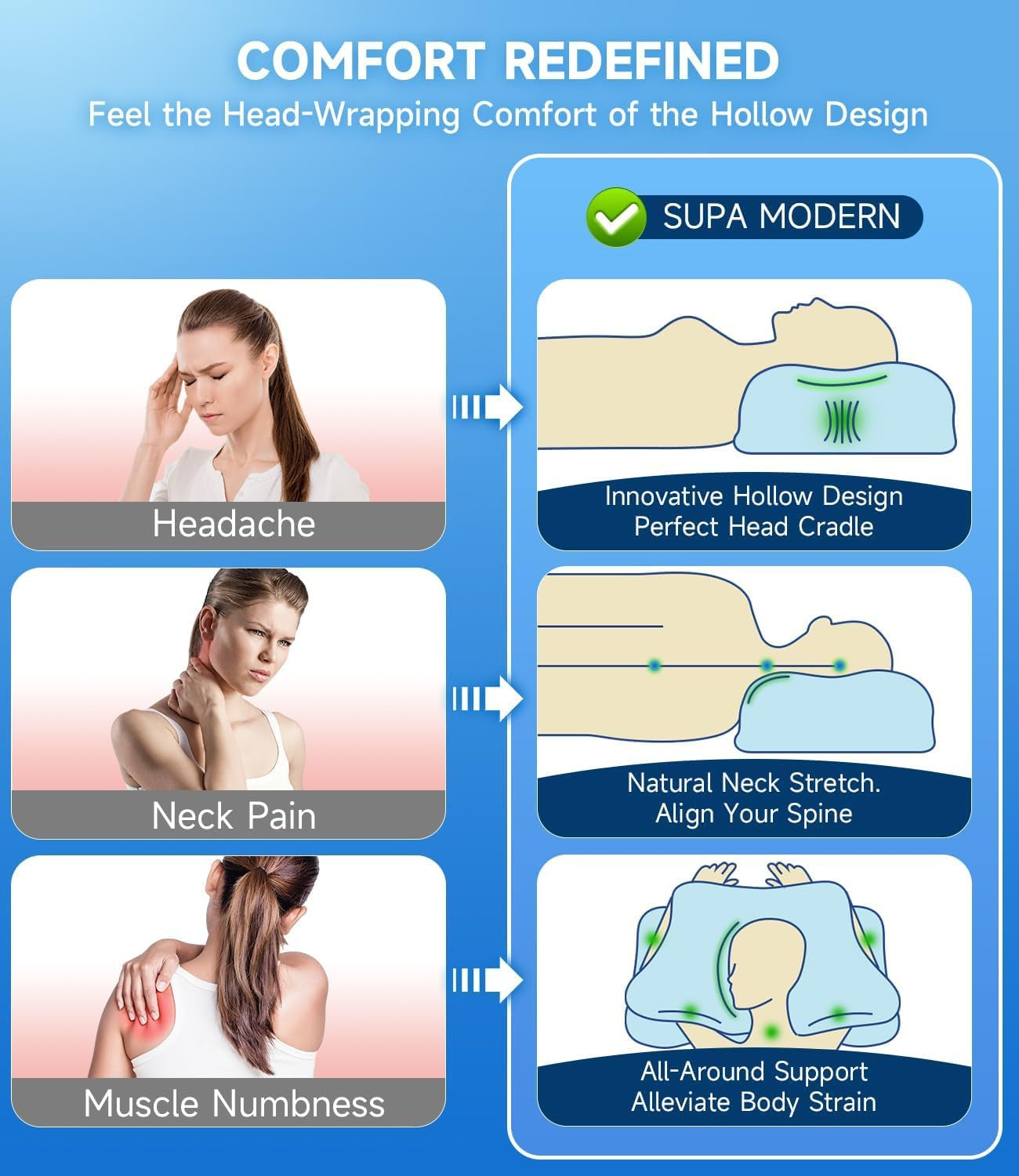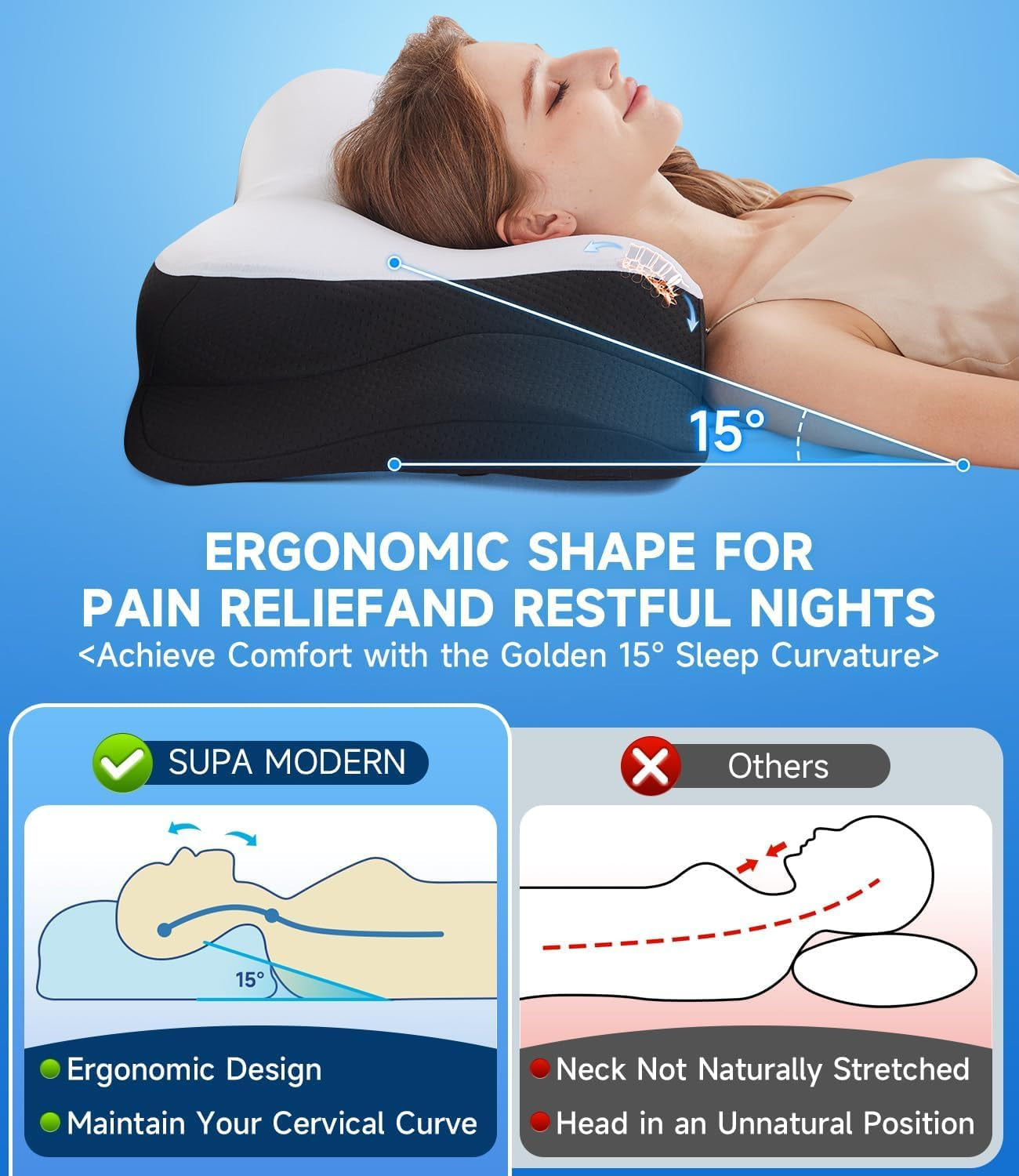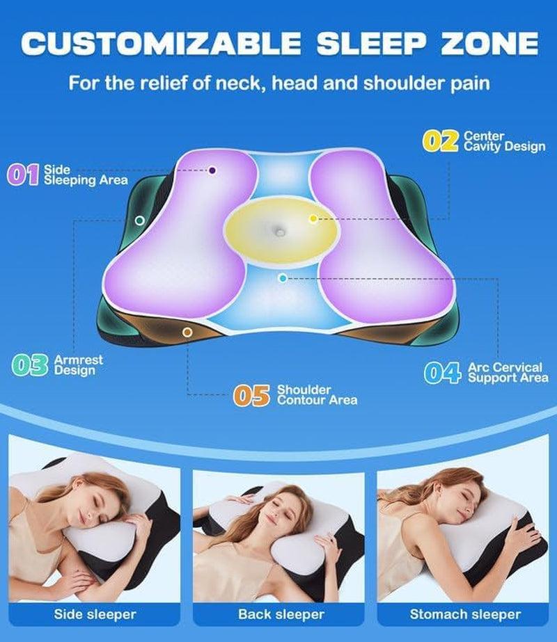 - « Le nouveau design apporte une expérience de sommeil extrême ». Êtes-vous affecté par des problèmes de sommeil ? Alors vous devriez choisir notre oreiller de soutien du cou. L'oreiller orthopédique a une conception creuse unique qui peut soutenir avec précision votre tête, répartir efficacement la pression et garantir que la colonne cervicale maintient une courbure physiologique de 15 degrés, réalisant l'alignement de la colonne cervicale et réduisant la pression physique pendant le sommeil. Un oreiller cervical vous aide à dire adieu aux troubles du sommeil et à saluer chaque matin avec vitalité et fraîcheur.