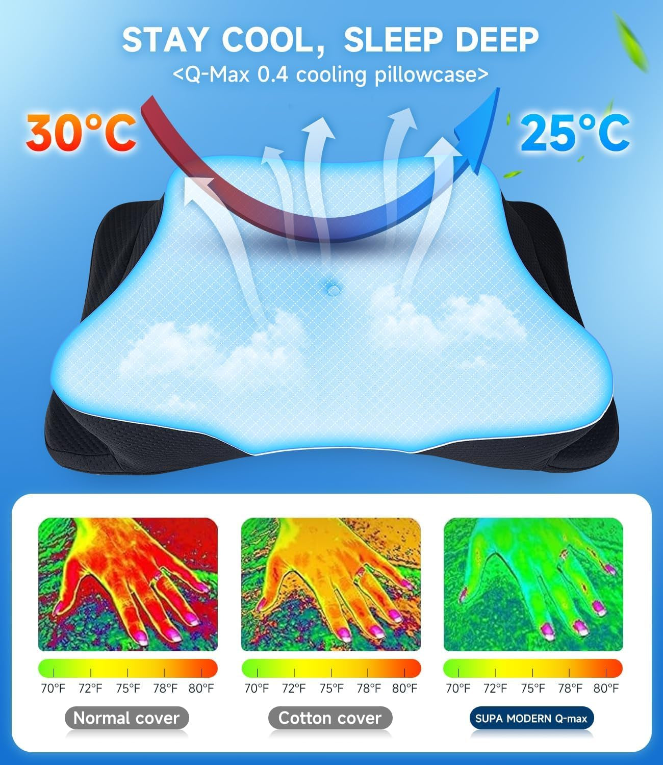 - « Oreiller cervical rafraîchissant amélioré » L'oreiller rafraîchissant en mousse à mémoire de forme pour dormeurs latéraux adopte la troisième génération de technologie de refroidissement, qui réduit instantanément la température de la peau de 5 degrés Celsius ! La chaleur est transférée au lieu d'être perdue. La face de l'oreiller de soutien du cou est faite de tissu en fibres frais et respirant, qui peut rapidement absorber et dissiper la chaleur de la tête. Avec un noyau interne en coton à mémoire de forme respirant à 97 % et un design creux, un système de conduction thermique est formé qui dissipe efficacement la chaleur. L'oreiller ventral n'est jamais trop froid ni trop chaud, et le confort de l'oreiller cervical est amélioré.