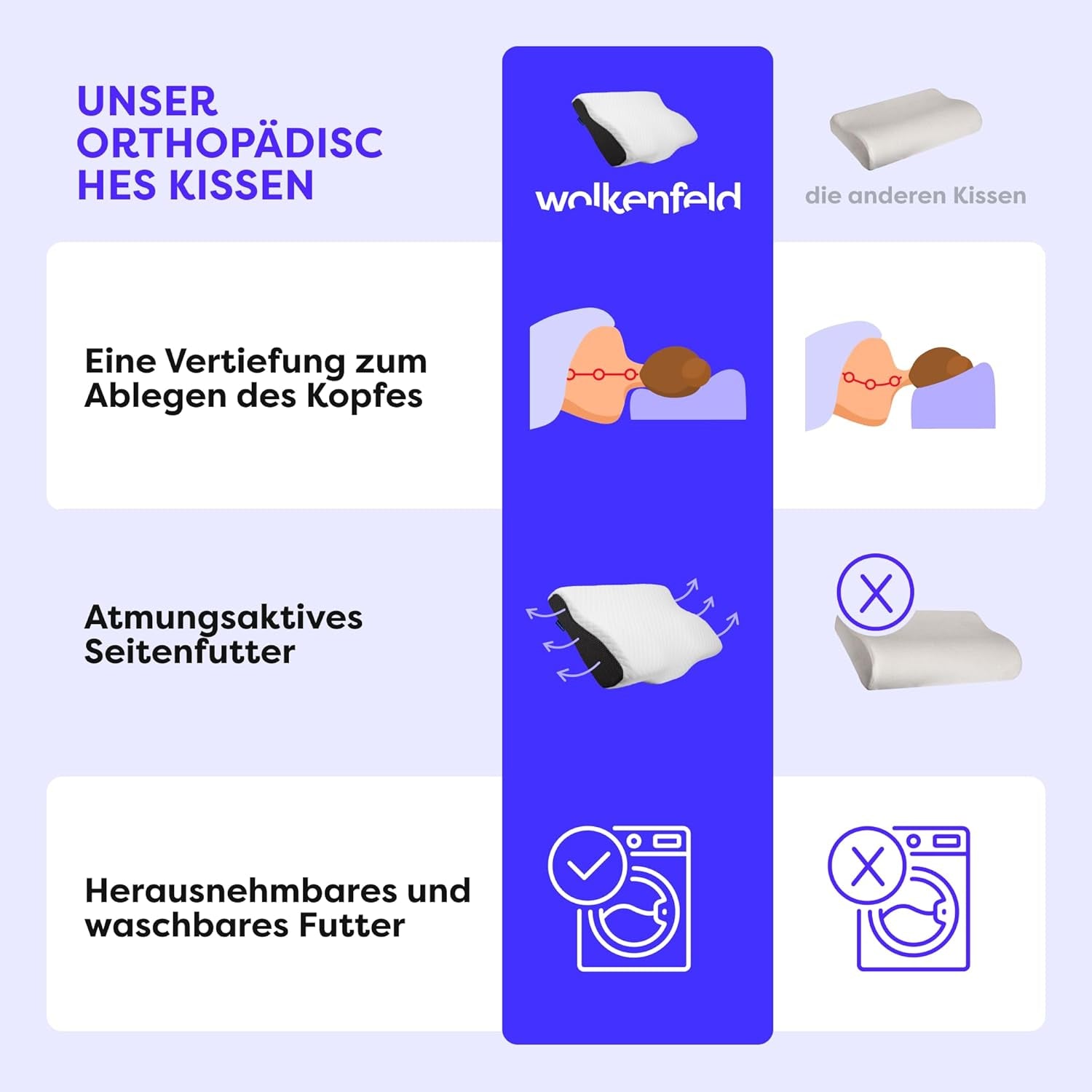 Wolkenfeld Oreiller orthopédique pour soulager les douleurs cervicales, oreiller cervical en mousse à mémoire de forme – Oreiller ergonomique pour la tête – Oreiller pour dormir sur le côté, le dos et le ventre